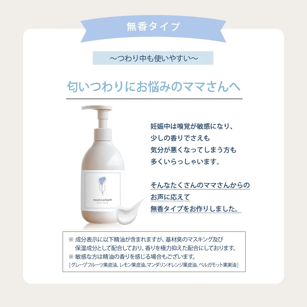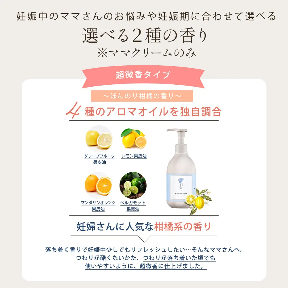 ママクリームは<無香タイプ>と<柑橘系の超微香タイプ>の2種類から選べちゃいます♪
