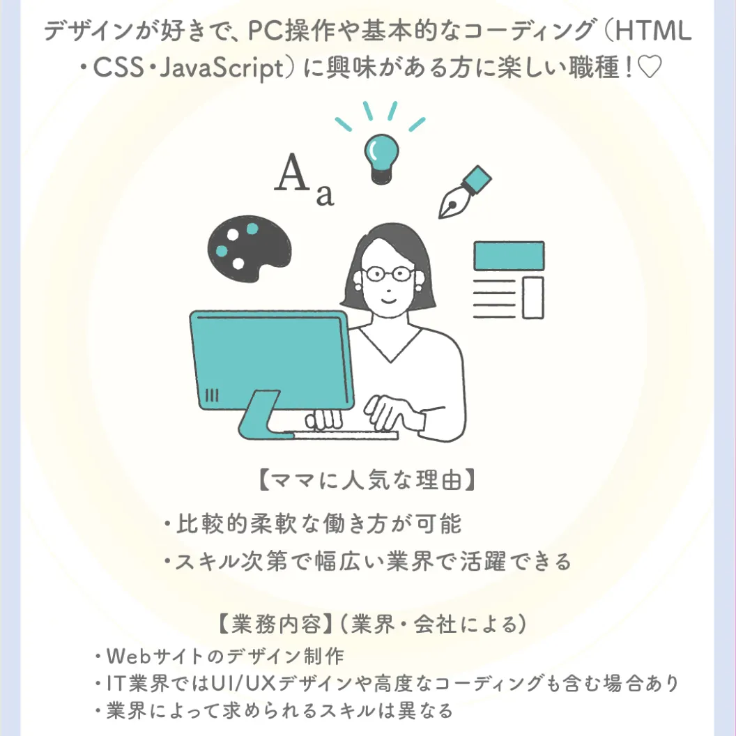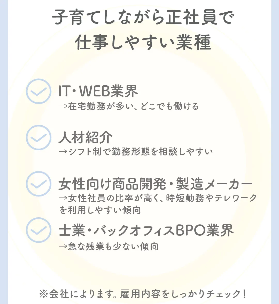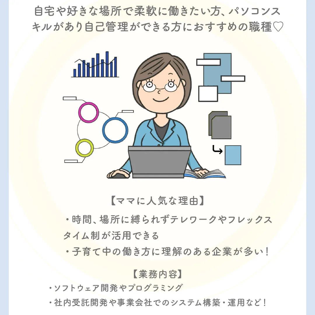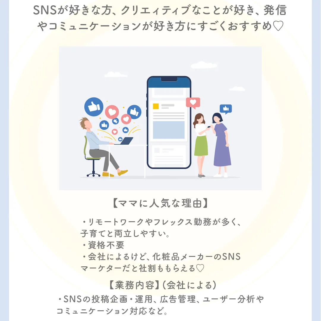 この投稿では、ワーママさんに人気の業界・職種を10個ご紹介しています🩵