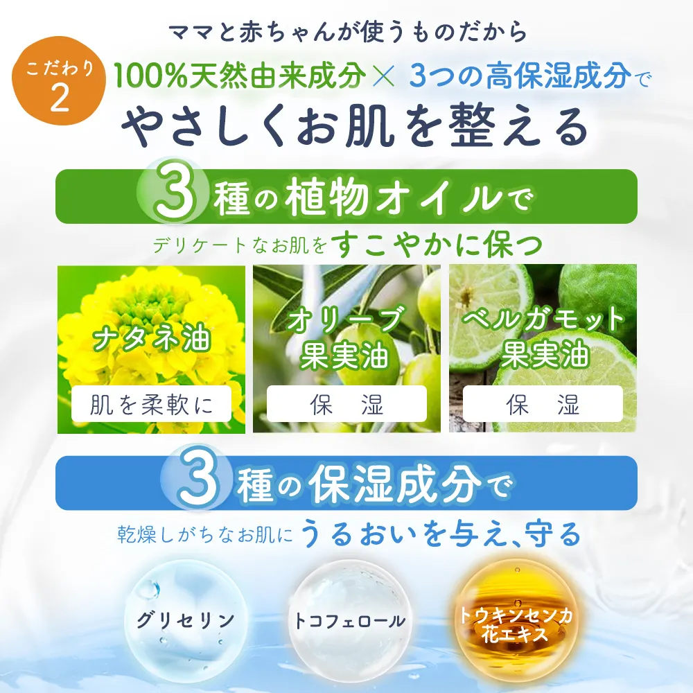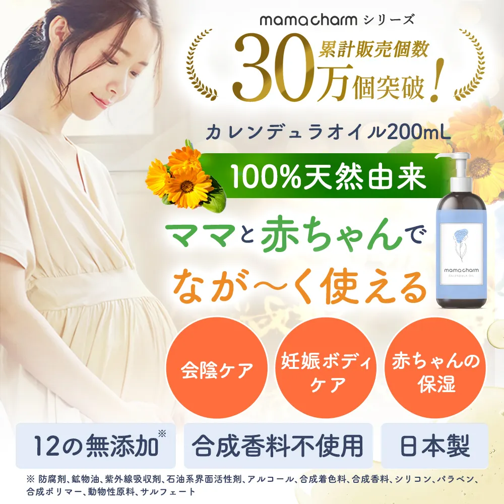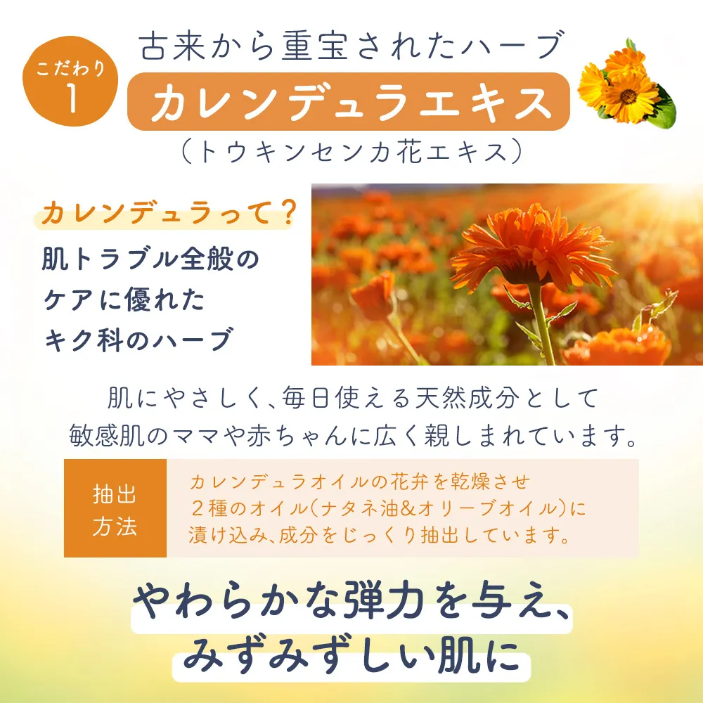 カレンデュラオイルは100%天然由来成分×3つの保湿成分で、敏感肌のママさんでもお肌をやさしく保湿して柔らかく保つことができちゃいます👶💕