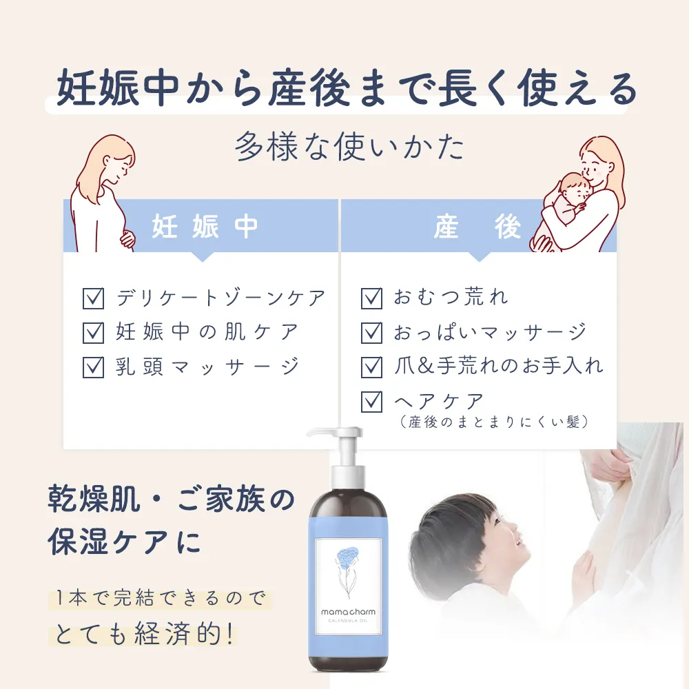 1本あるだけで"妊娠中"のデリケートゾーンのケアや肌ケアだけではなく、"産後"の肌ケアや赤ちゃんの肌ケアにも使えるのでいろいろな商品を準備しなくて済むのでとっても経済的!