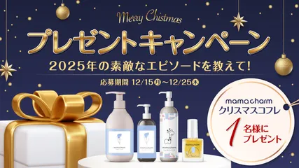 🎄投稿企画🎅「2025年の素敵なエピソードを教えて!」🎁 #クリスマスコフレ」「#ママチャームクリスマス」をつけて投稿。※投稿内容は、ママチャームの商品に関係のないエピソードで問題ございません。 プレゼント内容:ママクリーム×1、カレンデュラオイル×1、キッズミルクローション×1、バイバイチュッチュ×1がセットになったママチャーム クリスマスコフ